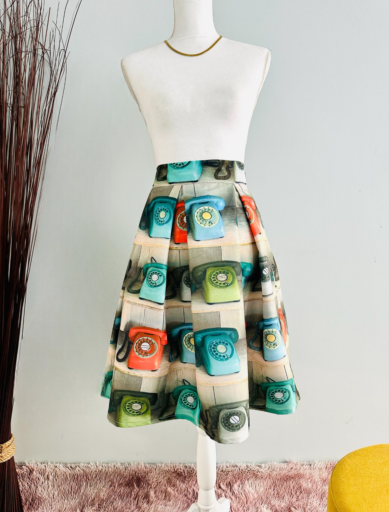 Falda de tablones invertidos con pretina y cierre en costado, diseño de teléfonos retro