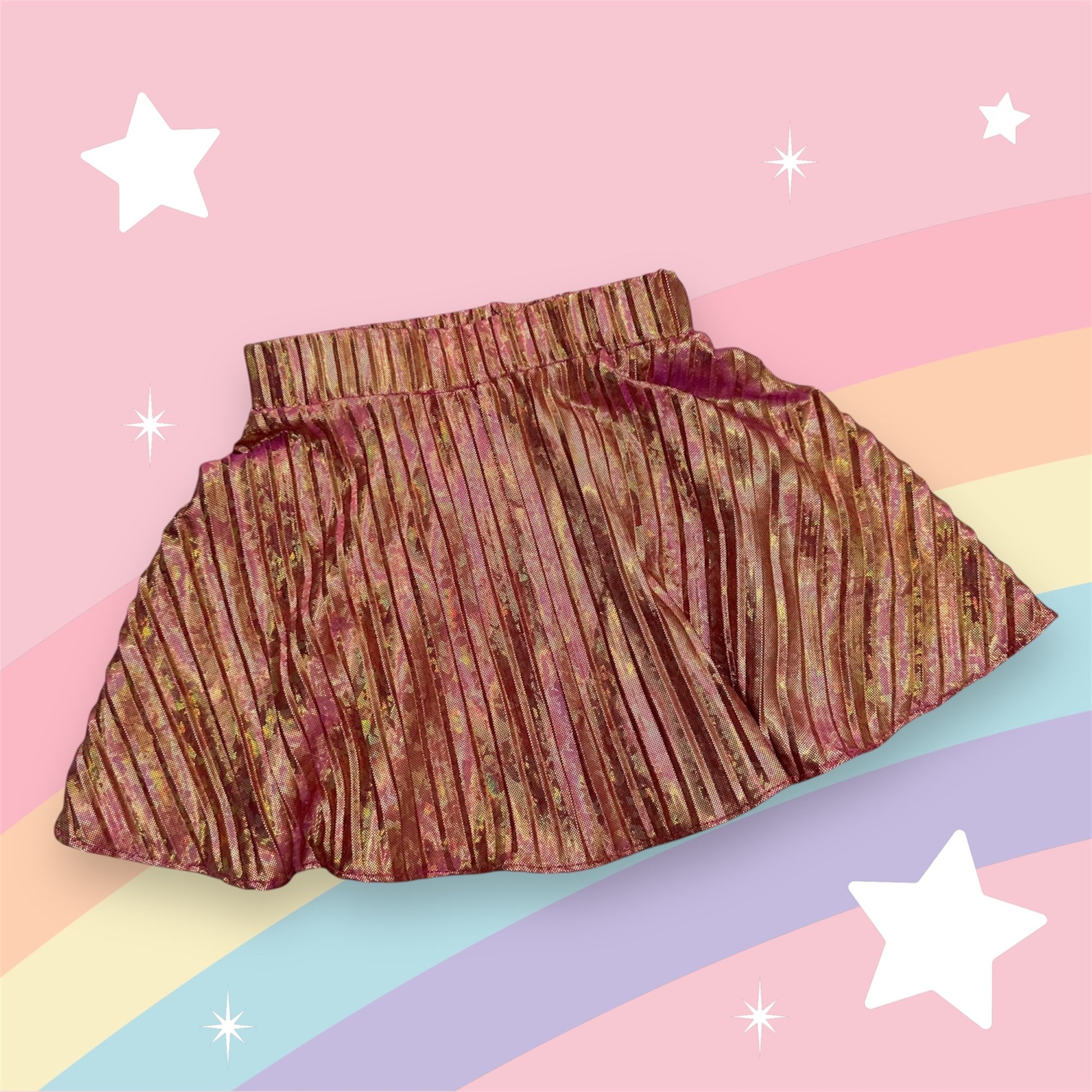 Falda metálica para niña, con elástico en cintura, corte circular.