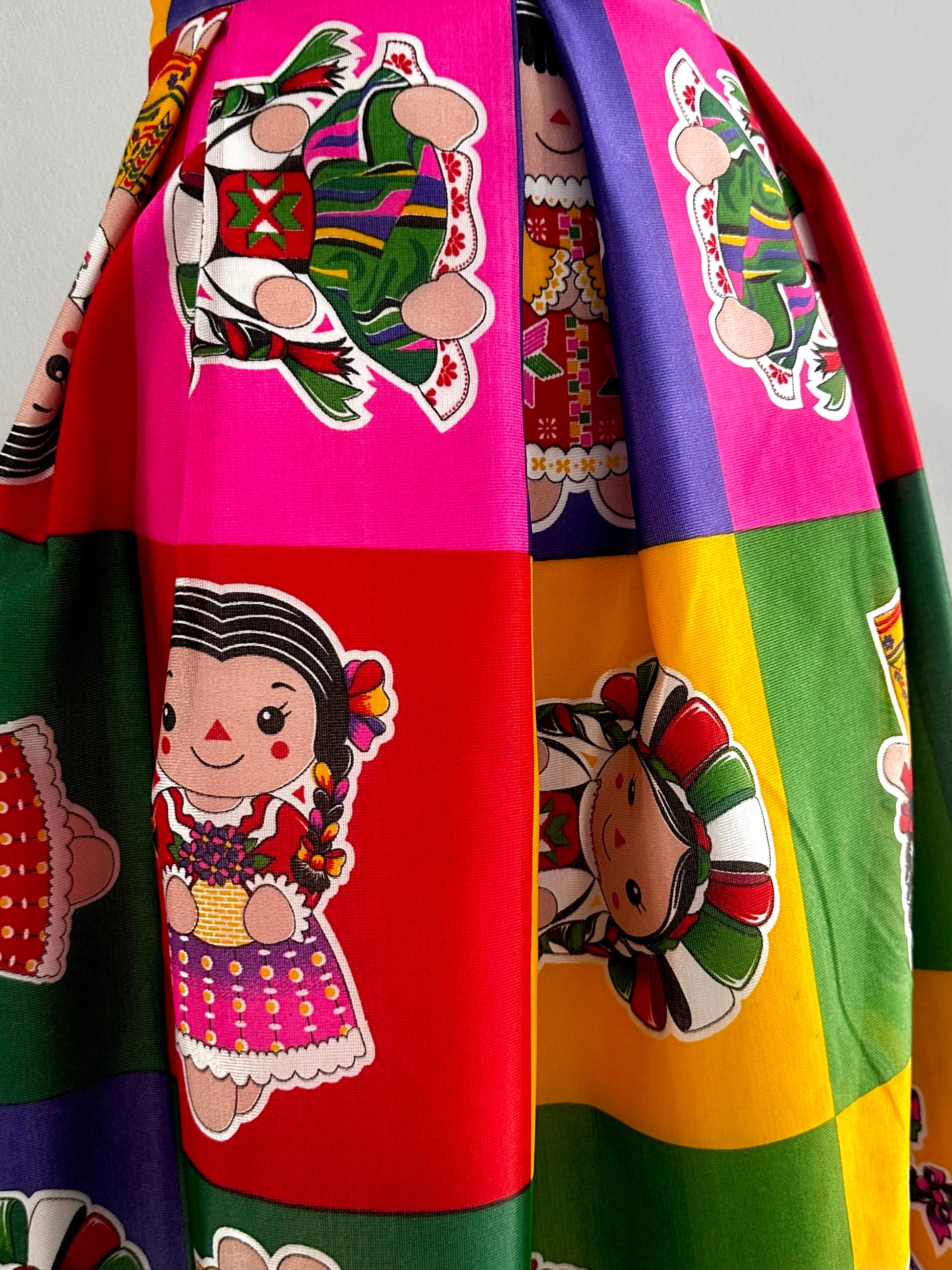 Falda midi con diseño de muñeca Lele, tablones invertidos, cierre en costado y forro.