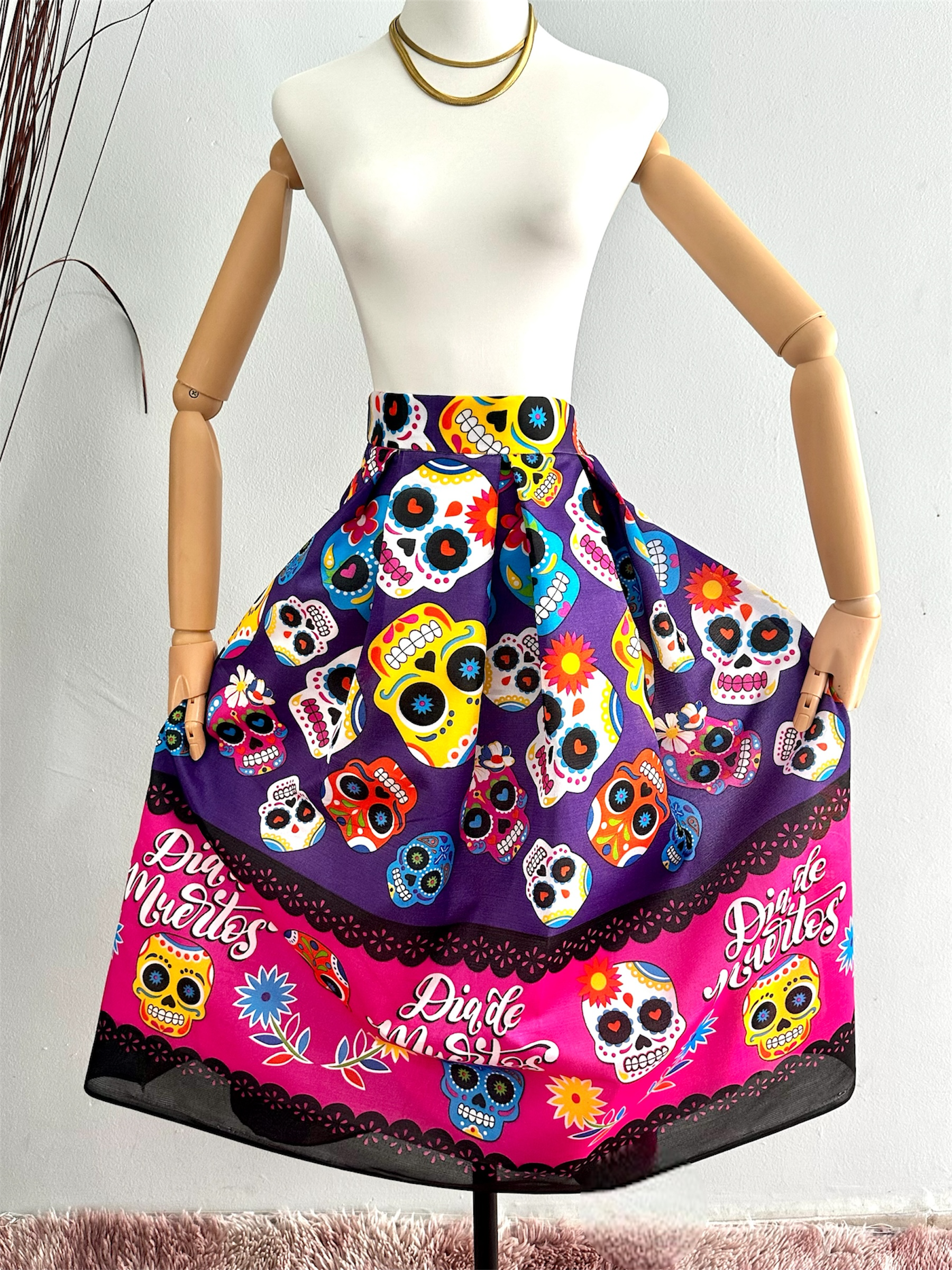 Falda con tablones invertidos, cierre en costado con diseño de calaveras.