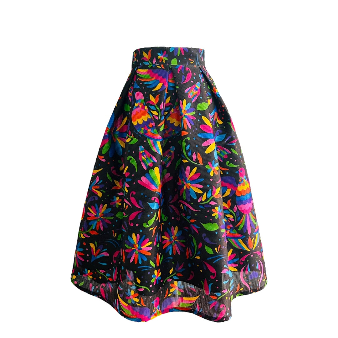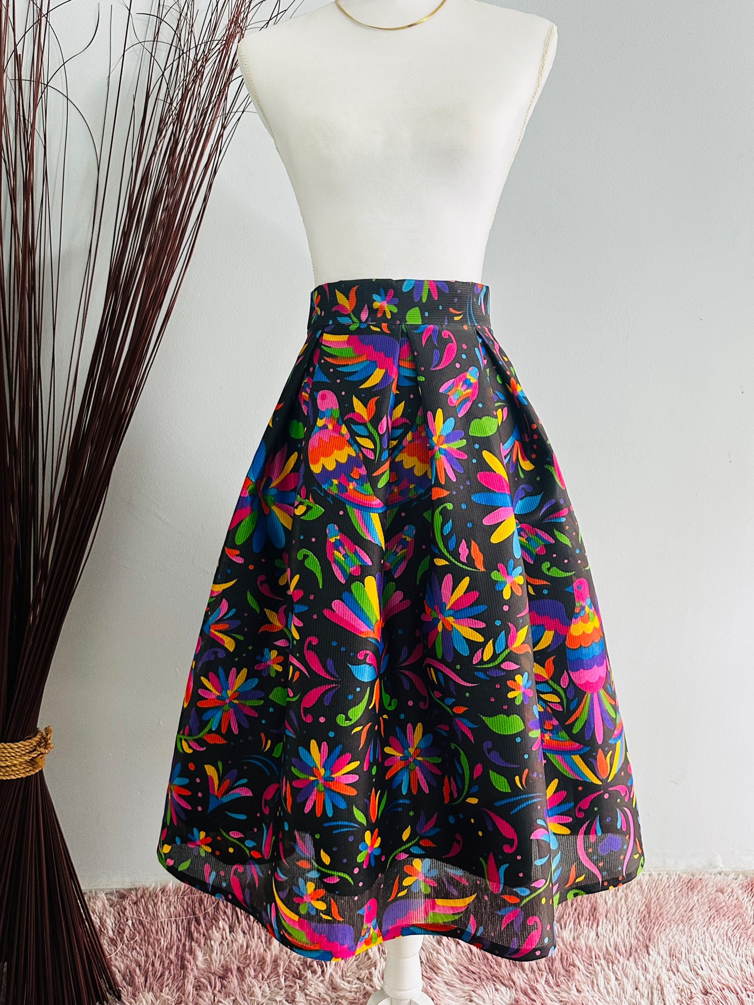 Falda midi con diseño mexicano, tablones invertidos, cierre en costado y forro.
