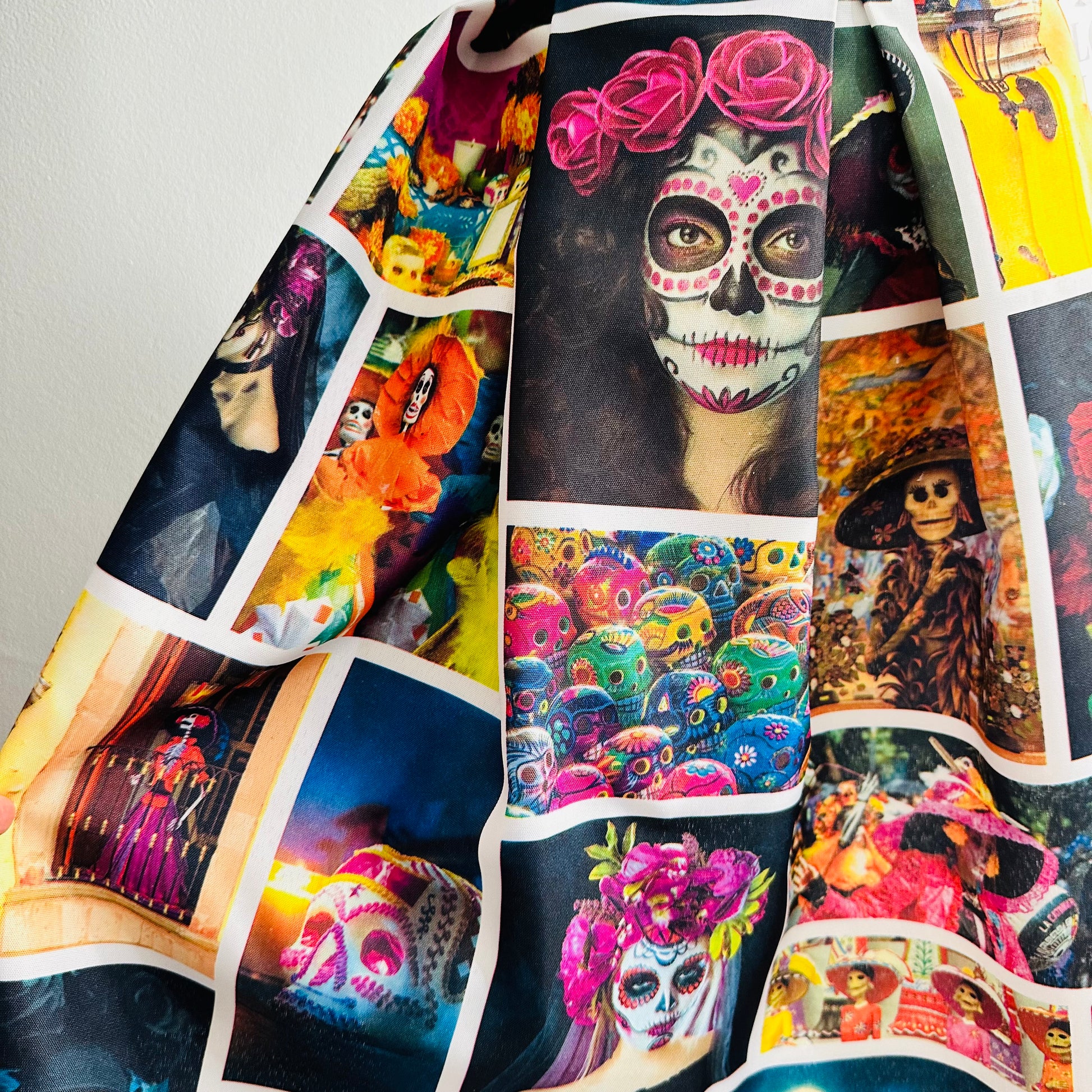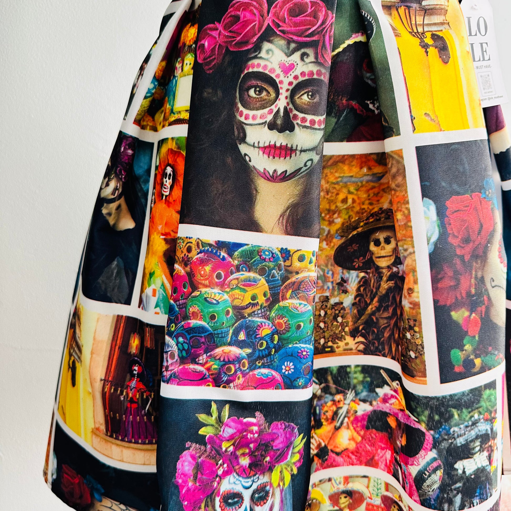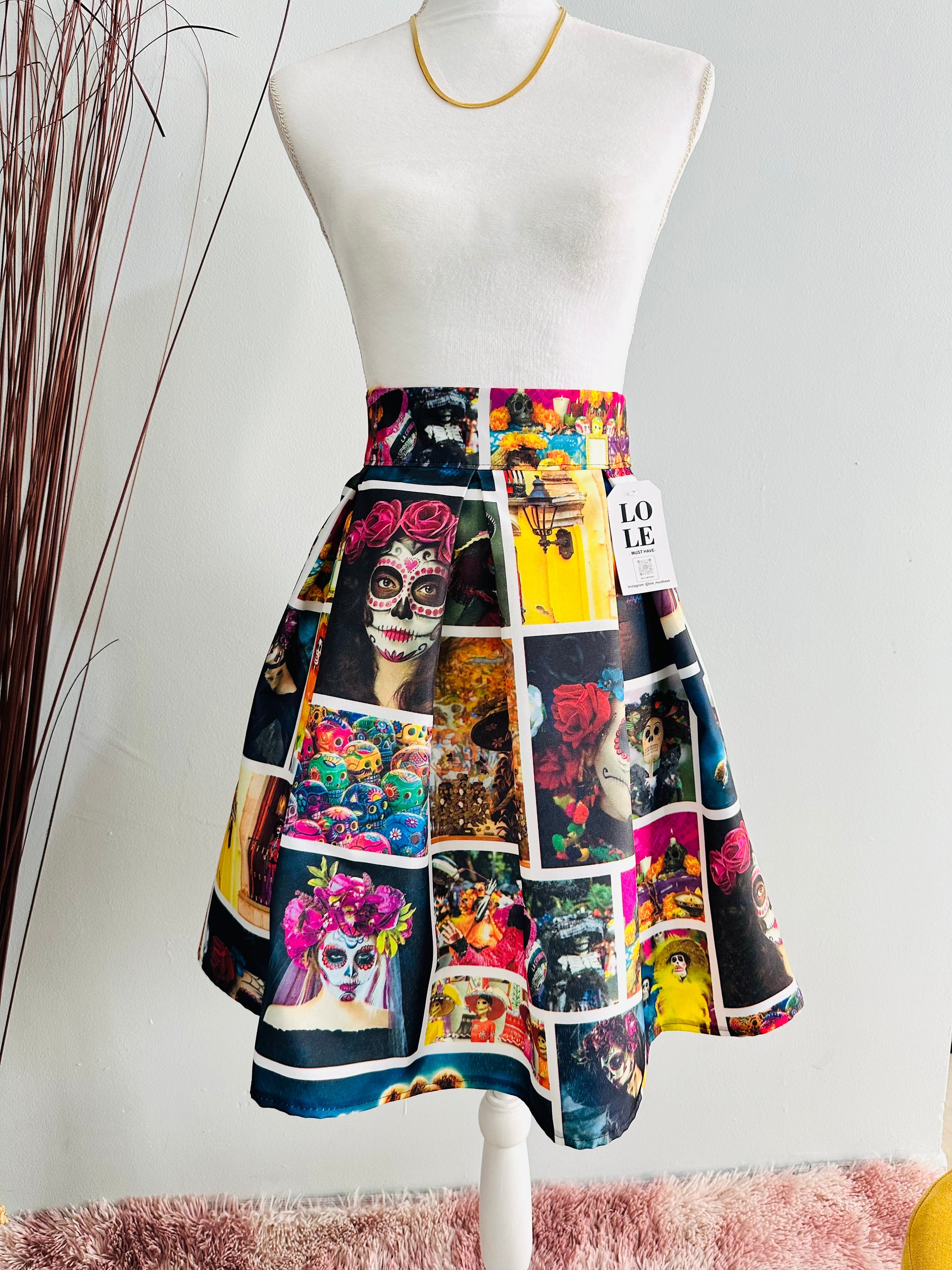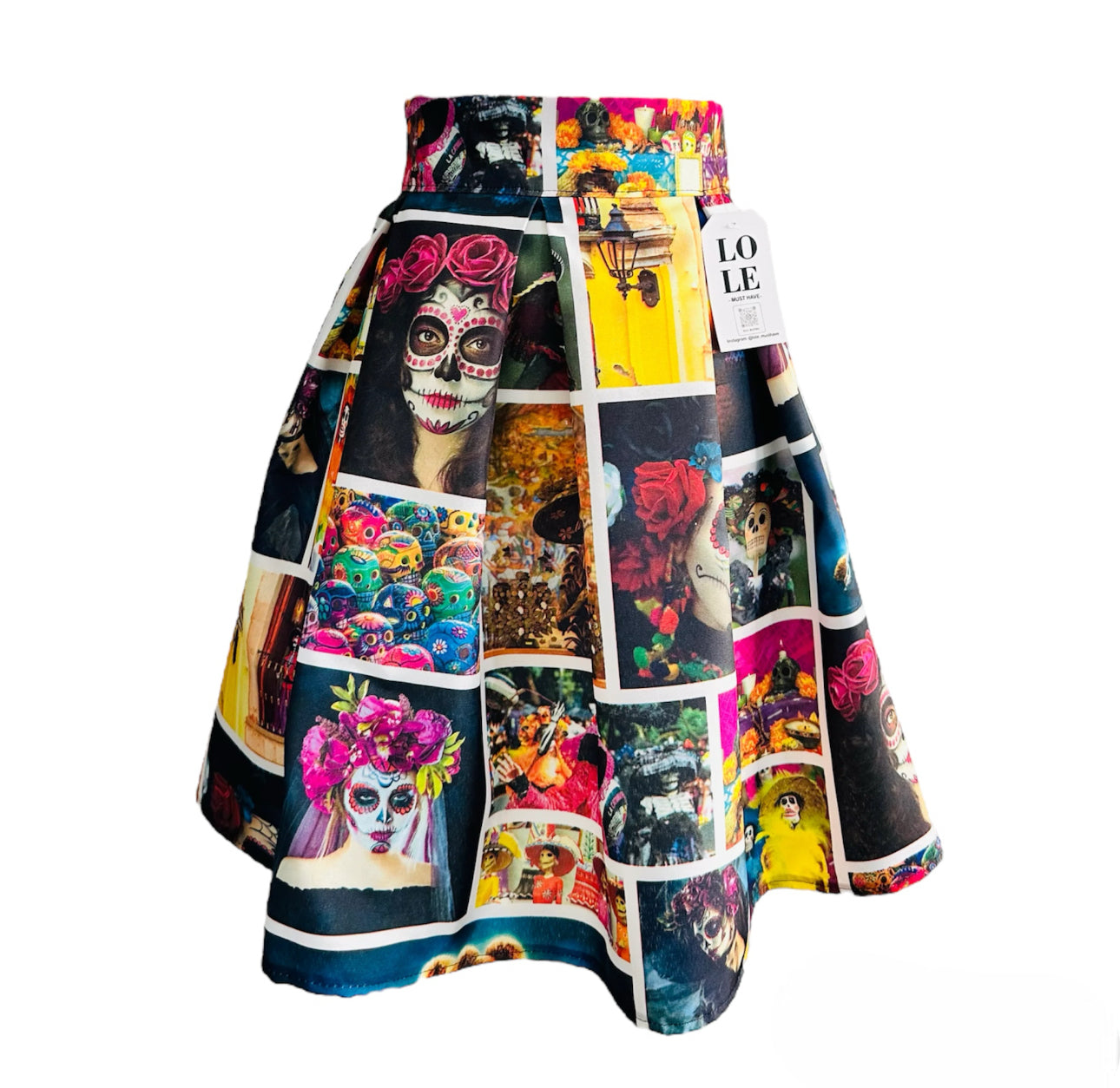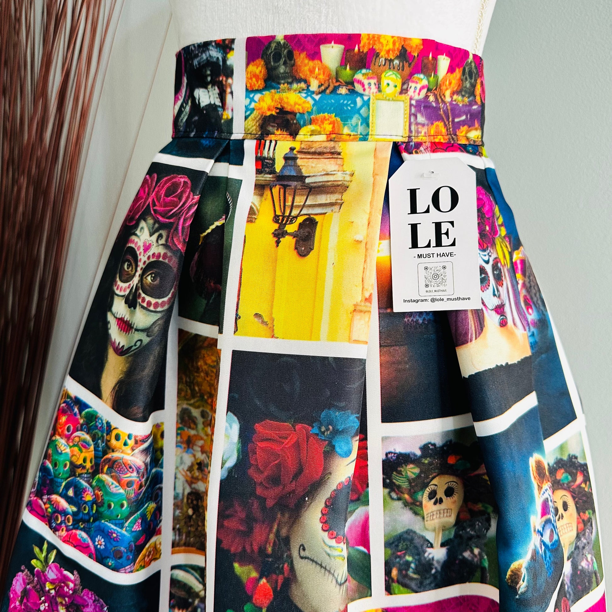 Hermosa y original falda con motivo de las tradiciones mexicanas, tablones invertidos, pretina ancha y cierre en costado.