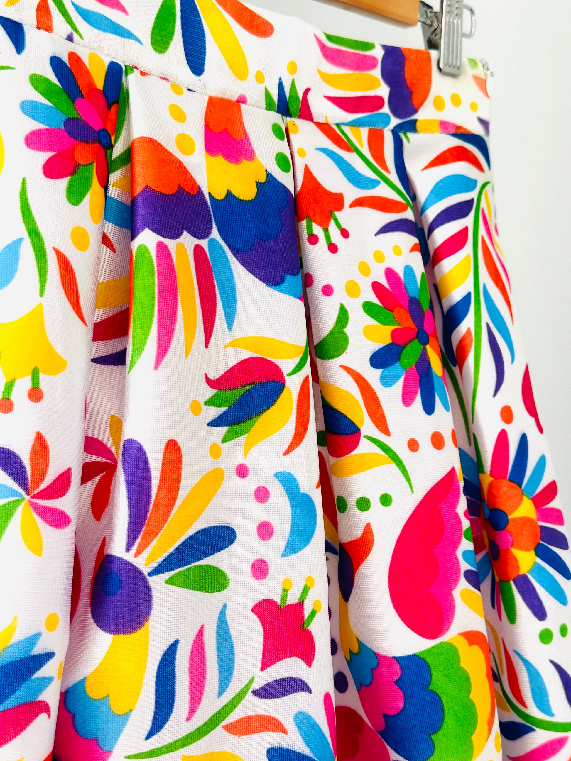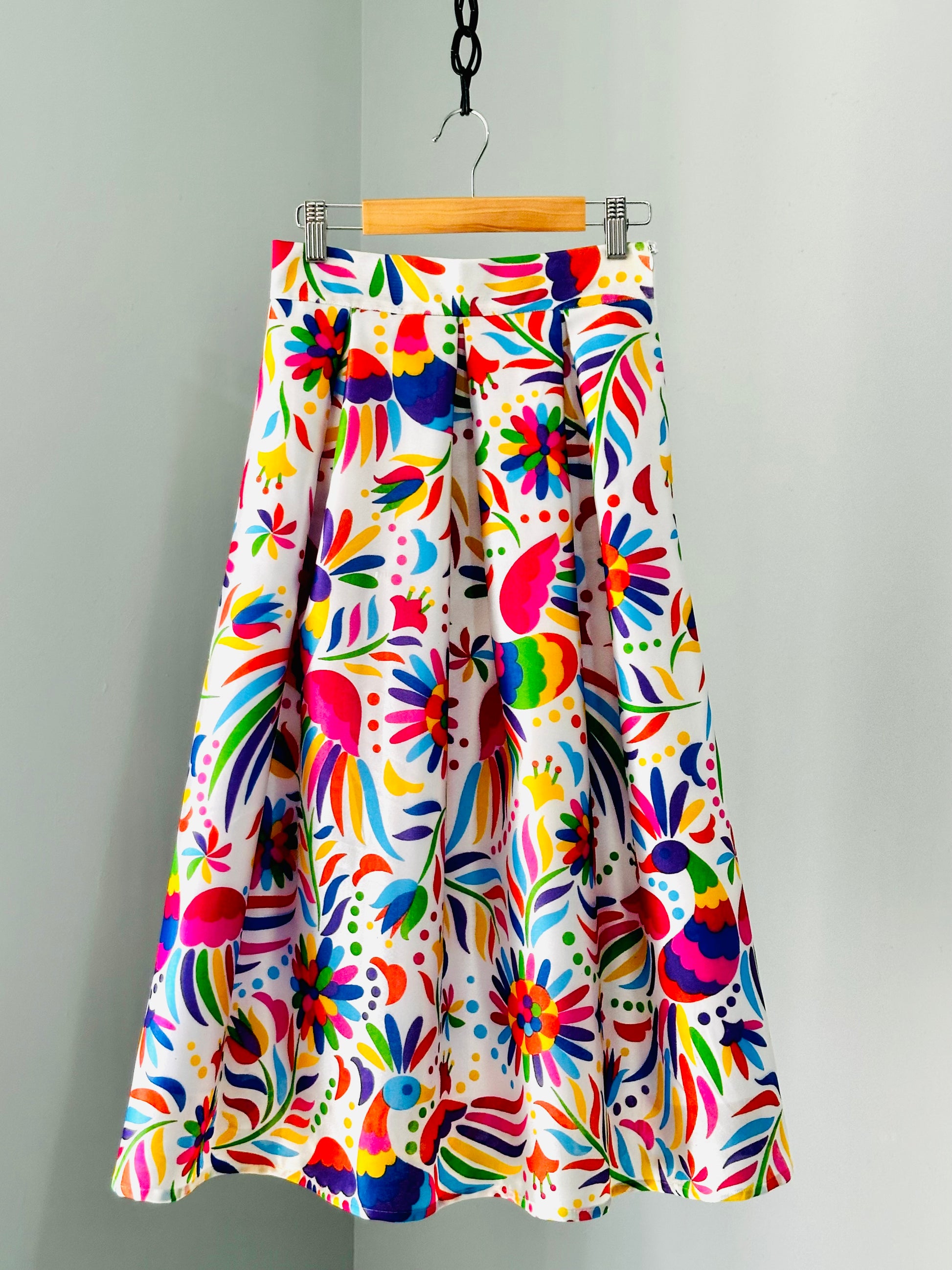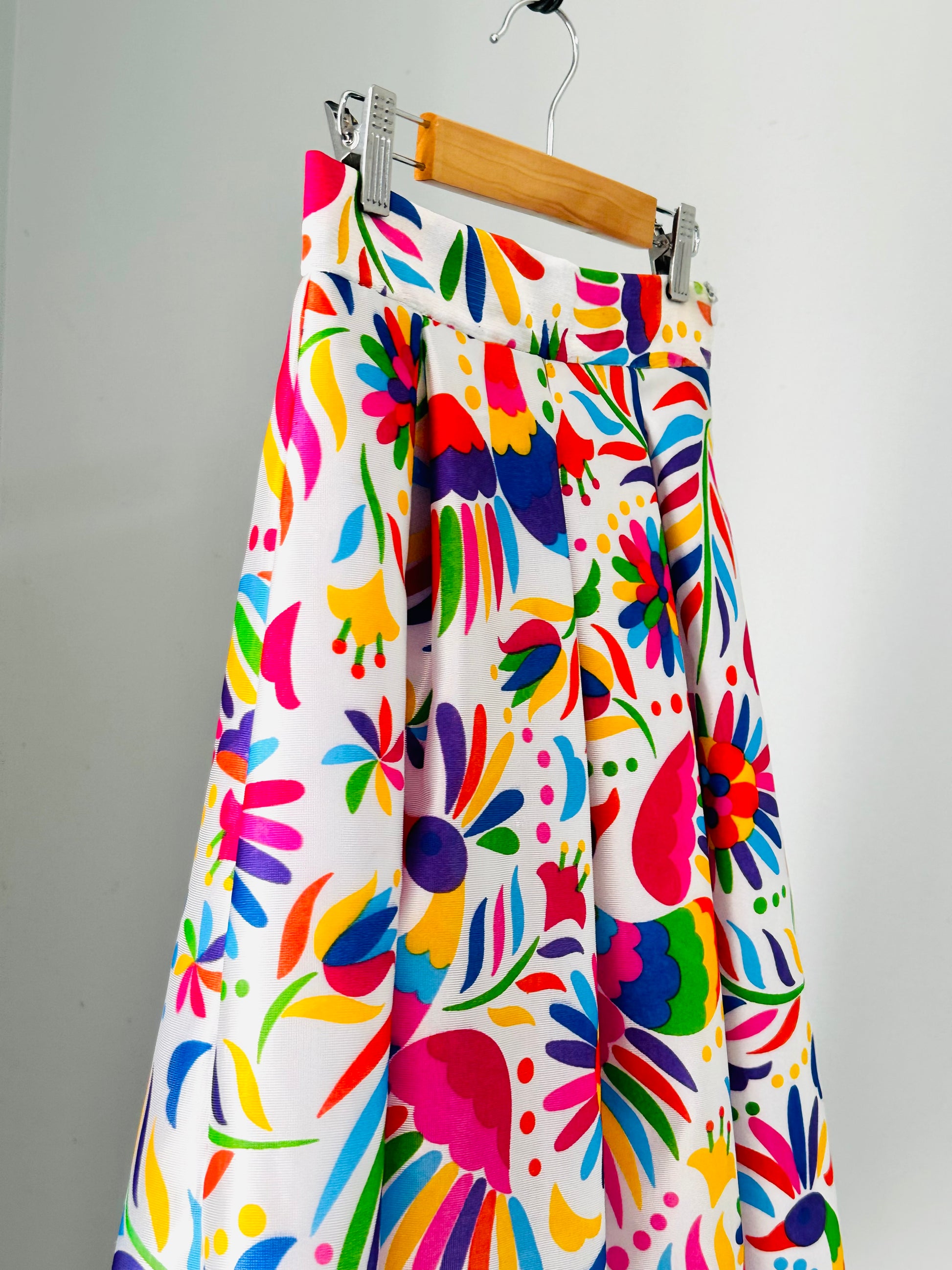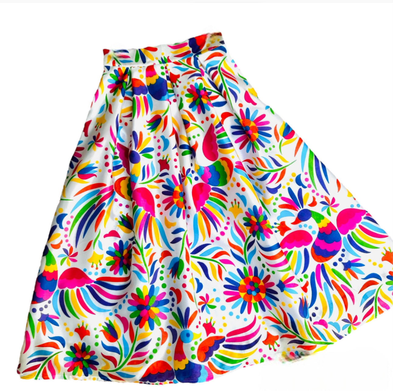 Falda midi con diseño mexicano, tablones invertidos, cierre en costado y forro.