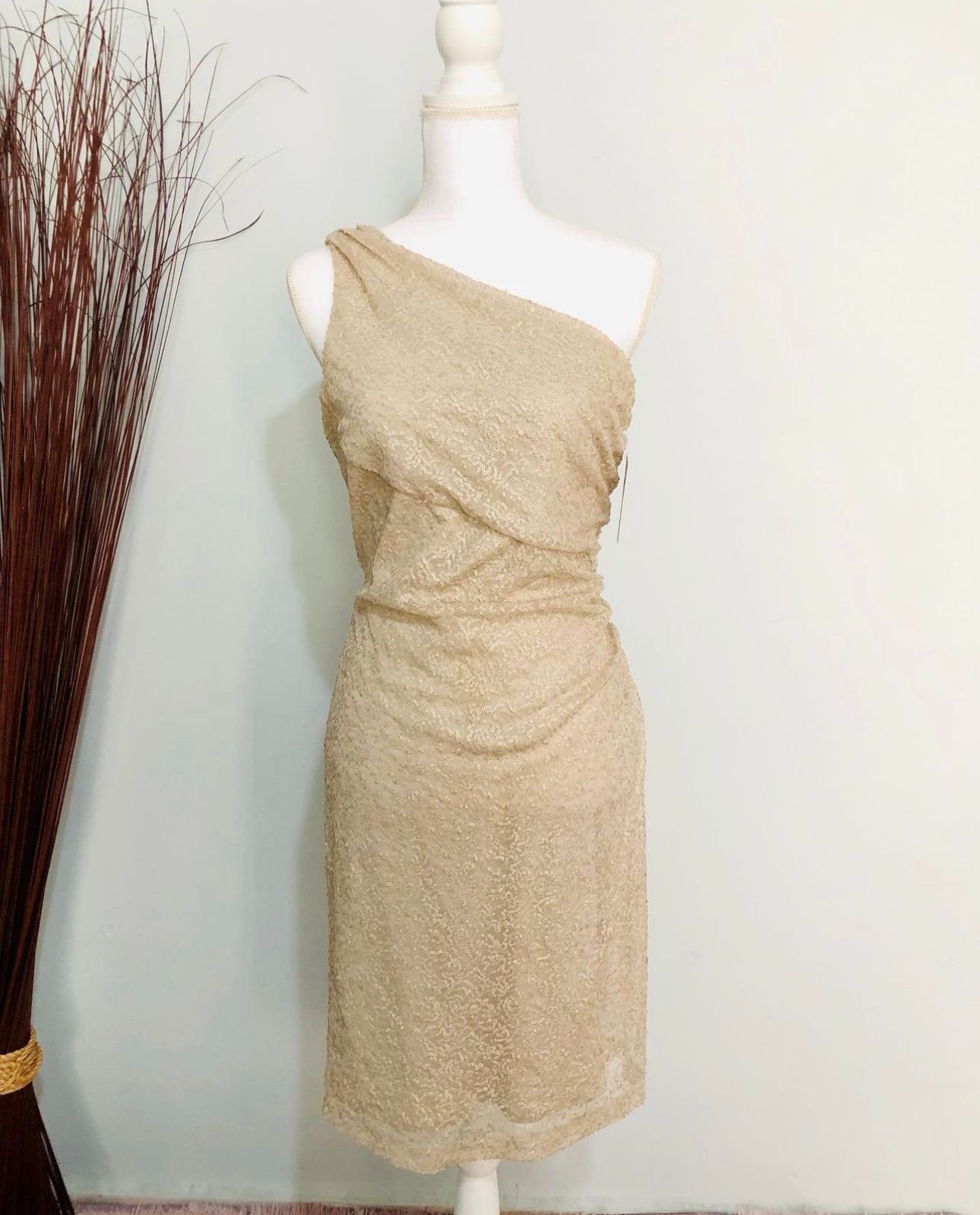 Elegante vestido en color beige, drapeado y cierre en costado para acentuar la cintura
